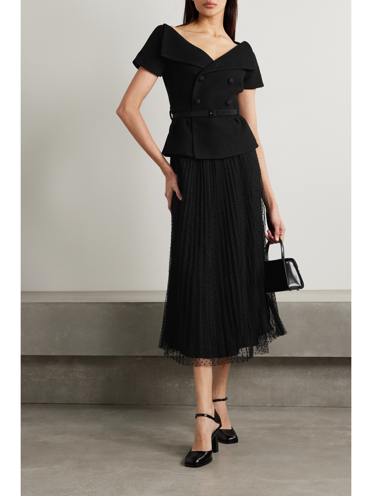Off-the-shoulder tweed and pleated Swiss-dot tulle midi dress