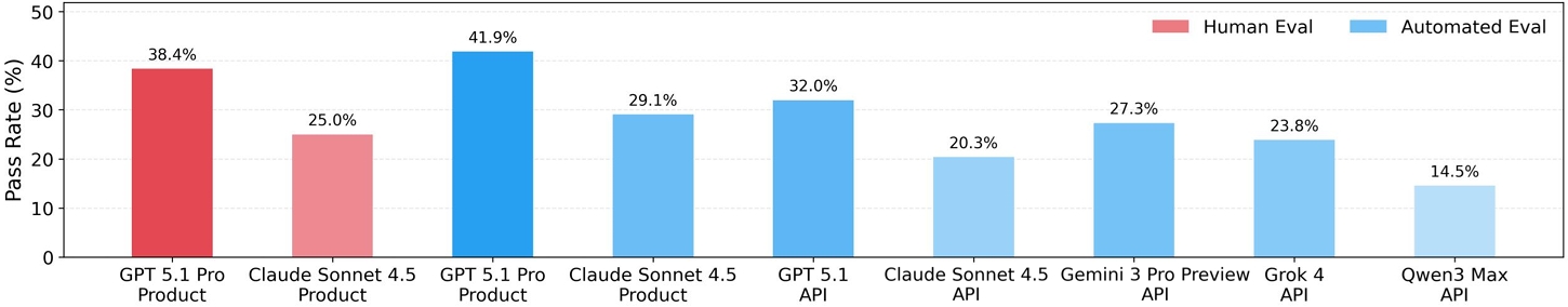 We conduct both human and automated evaluations of frontier AI systems including GPT5.1, Claude Sonnet 4.5, Gemini 3 Pro, Grok 4, and Qwen 3 Max. GPT 5.1 Pro spends 16 mins for each workflow on average and gets the highest pass rate of 38%, while Claude Sonnet 4.5 passes just 25.0%, revealing a substantial performance gap for real-world enterprise scenarios.