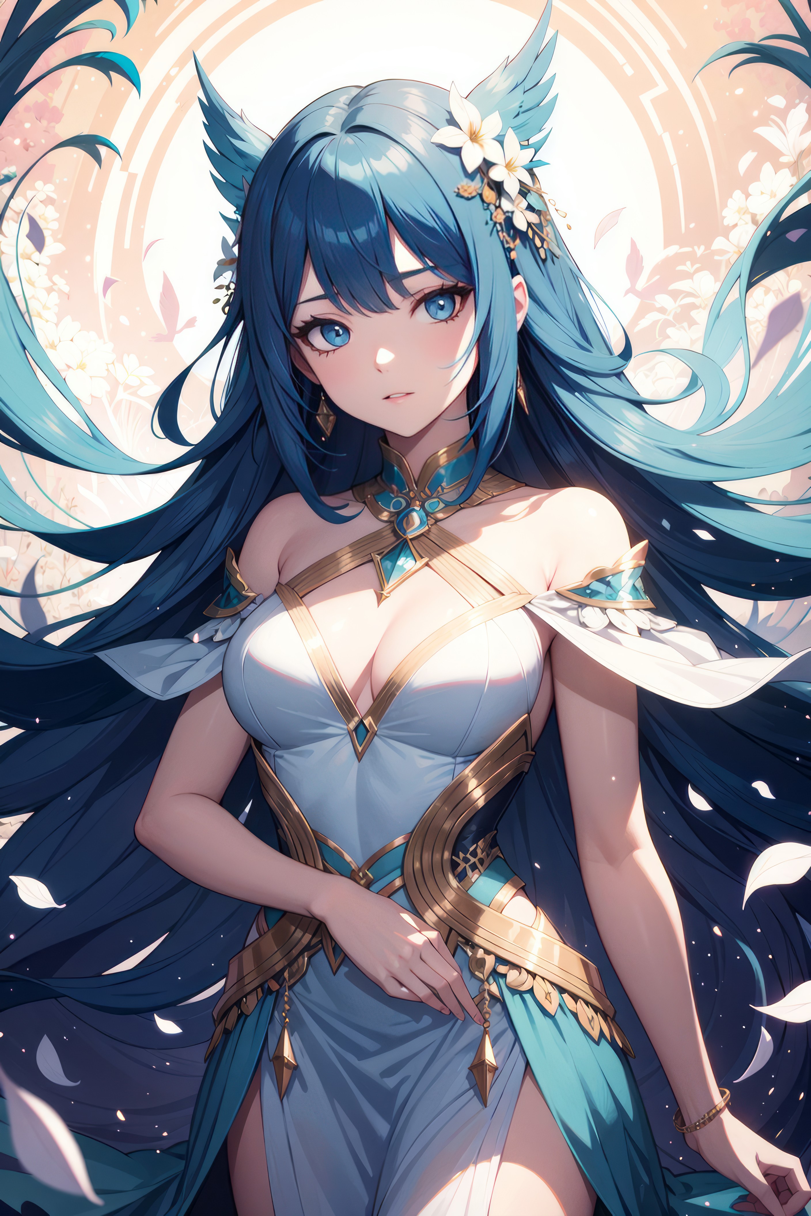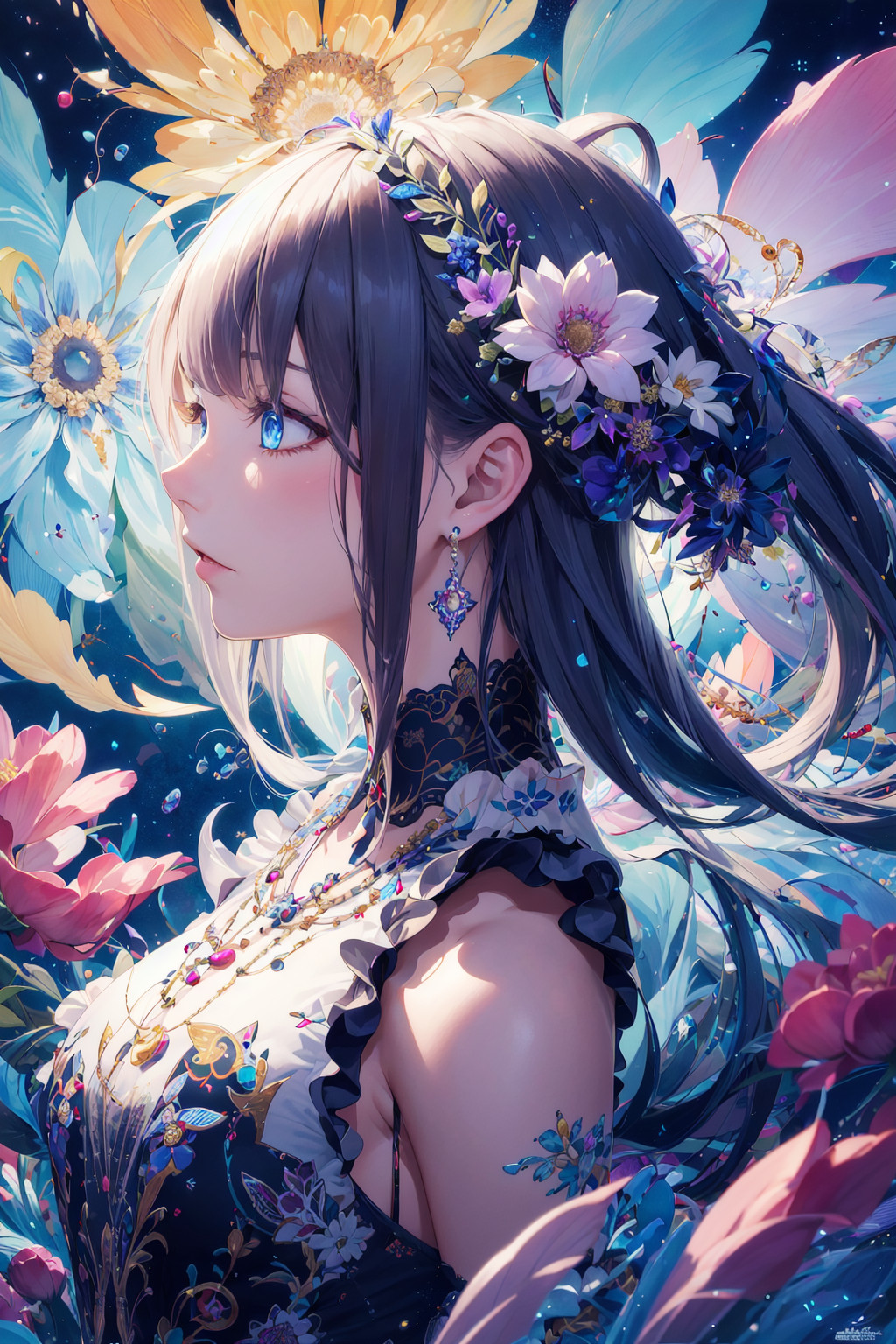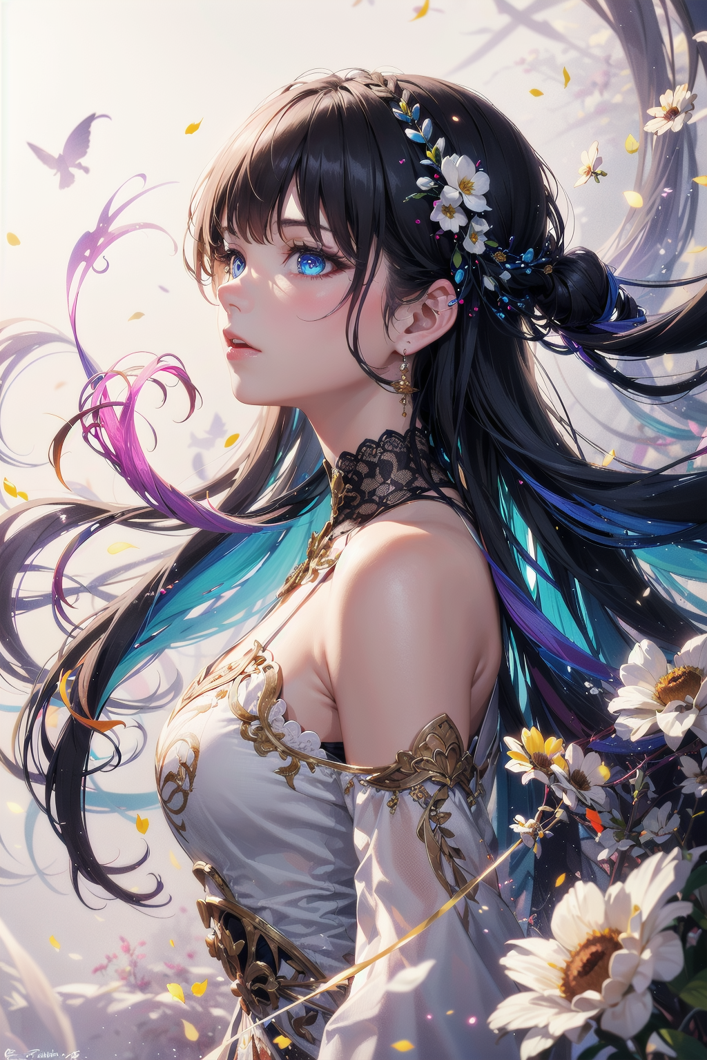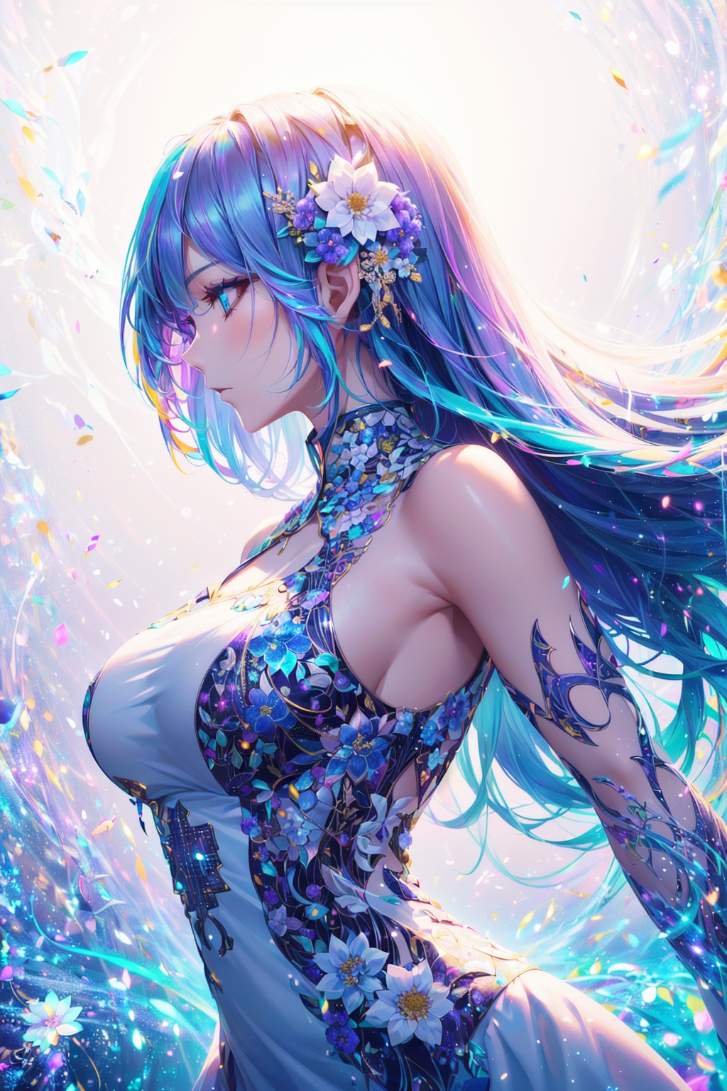 Craft an ethereal maiden adorned with intricate, shimmering patterns, her vibrant blue hair flowing amidst delicate blossoms, evoking a sense of otherworldly elegance,