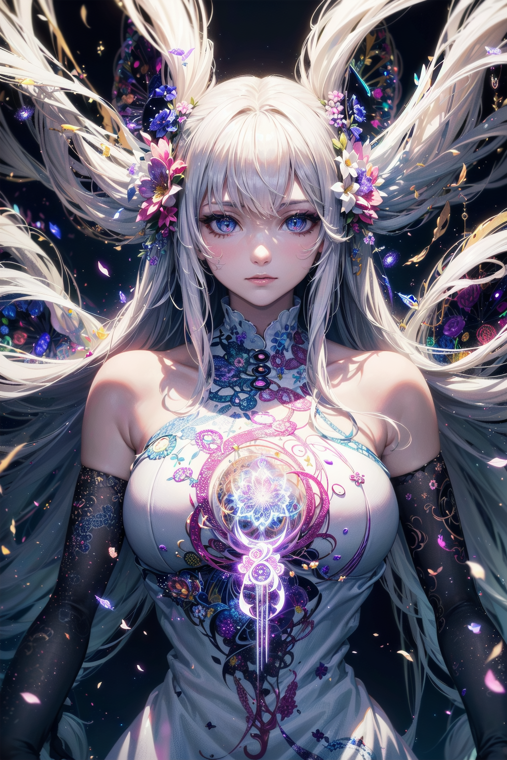 (complex background:1.3), (flower effects, dna effects:1.2), (white effects:1.2),