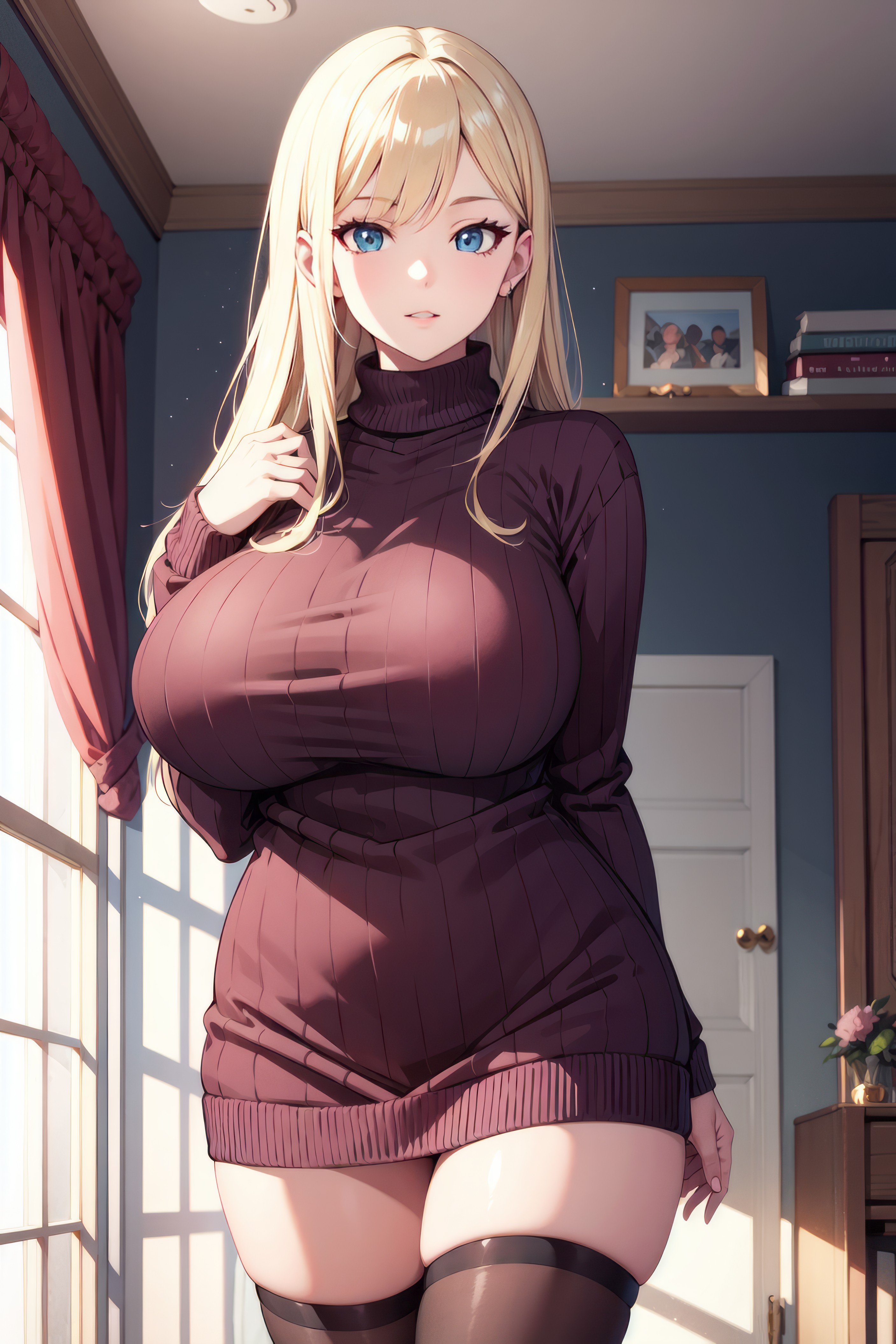 thighhighs, (gigantic breasts:0.8), (sweater:1.2),