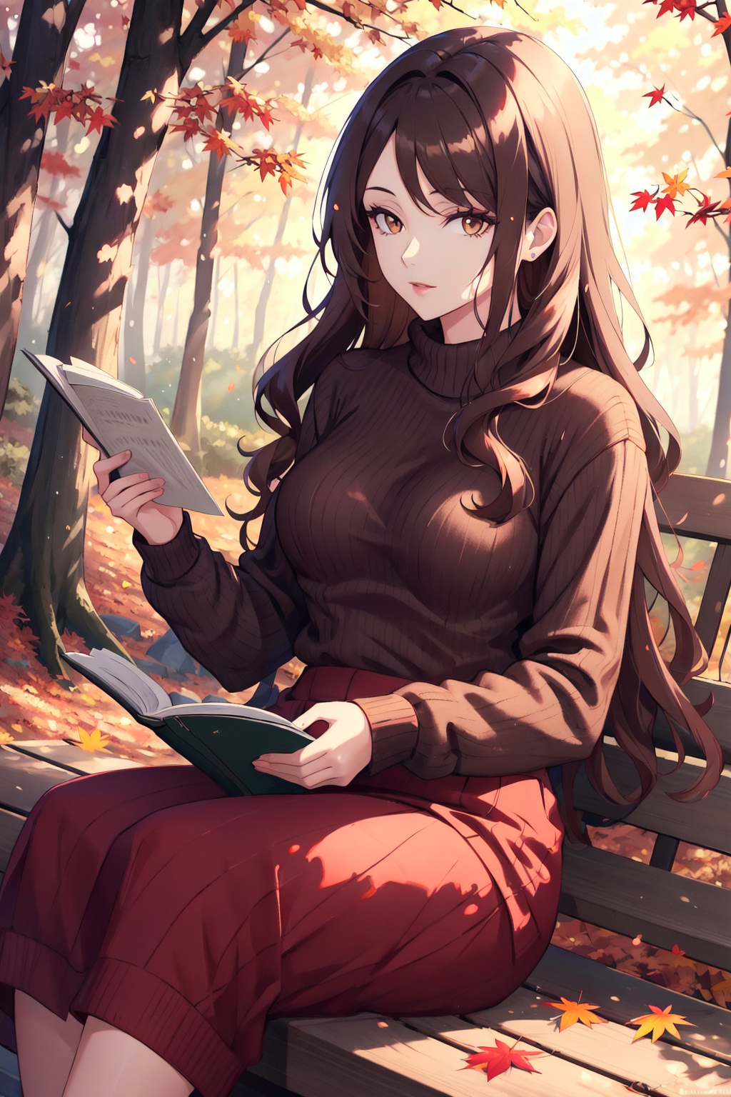 high clarity, reading pose, beautiful woman, long wavy brown hair, cozy sweater, autumn forest, gouache style, golden hour light