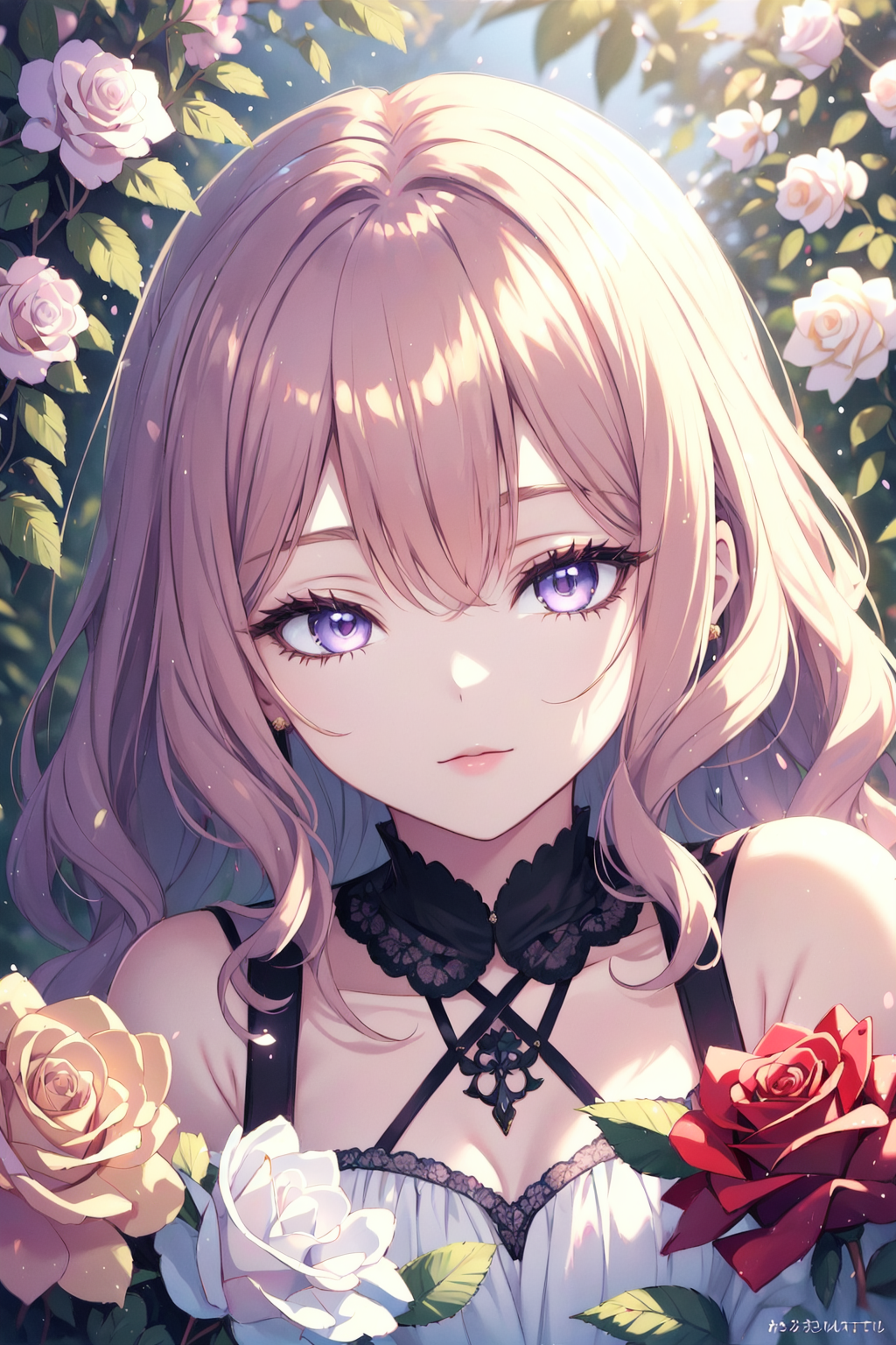 soft focus, angelic child, curly golden hair, pastel-colored dress, blooming rose garden, pastel art, glowing edges