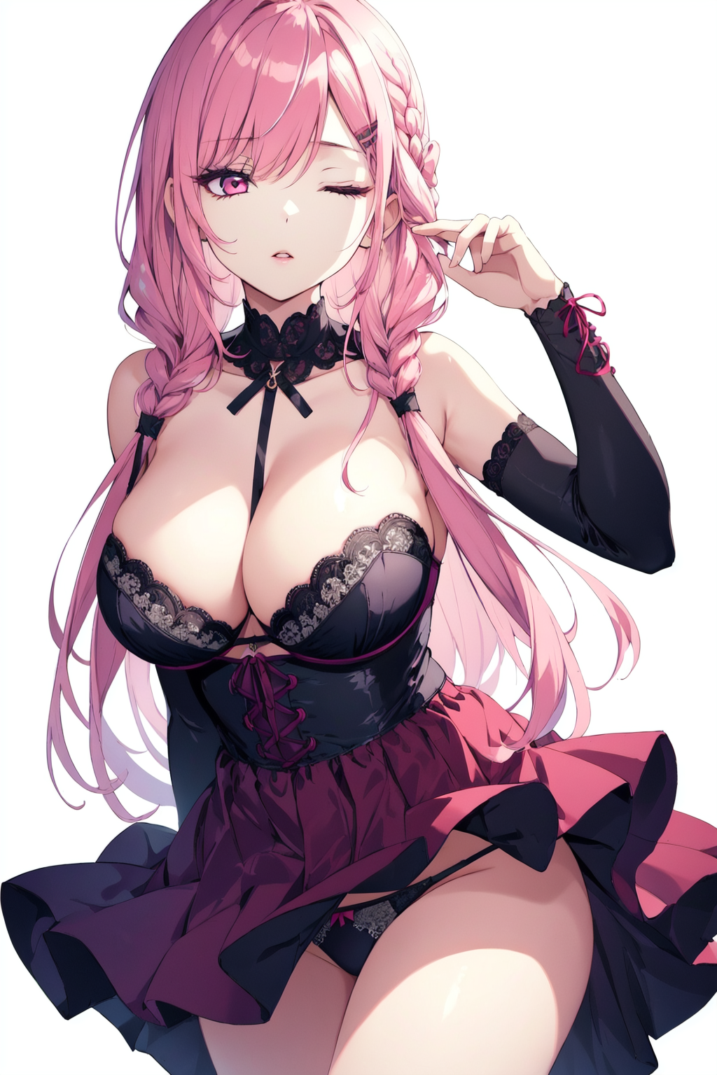 beautiful person, french-braid-hair, honey pink hair, pink eye,