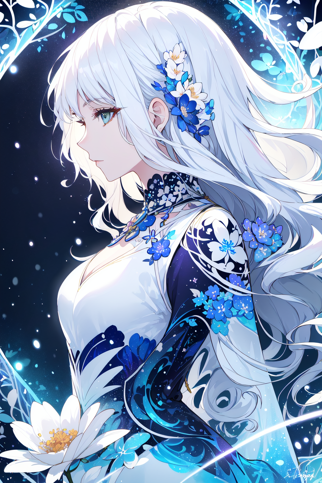 (complex background:1.1), (flower effects, dna effects:1.2), (white effects:1.2),