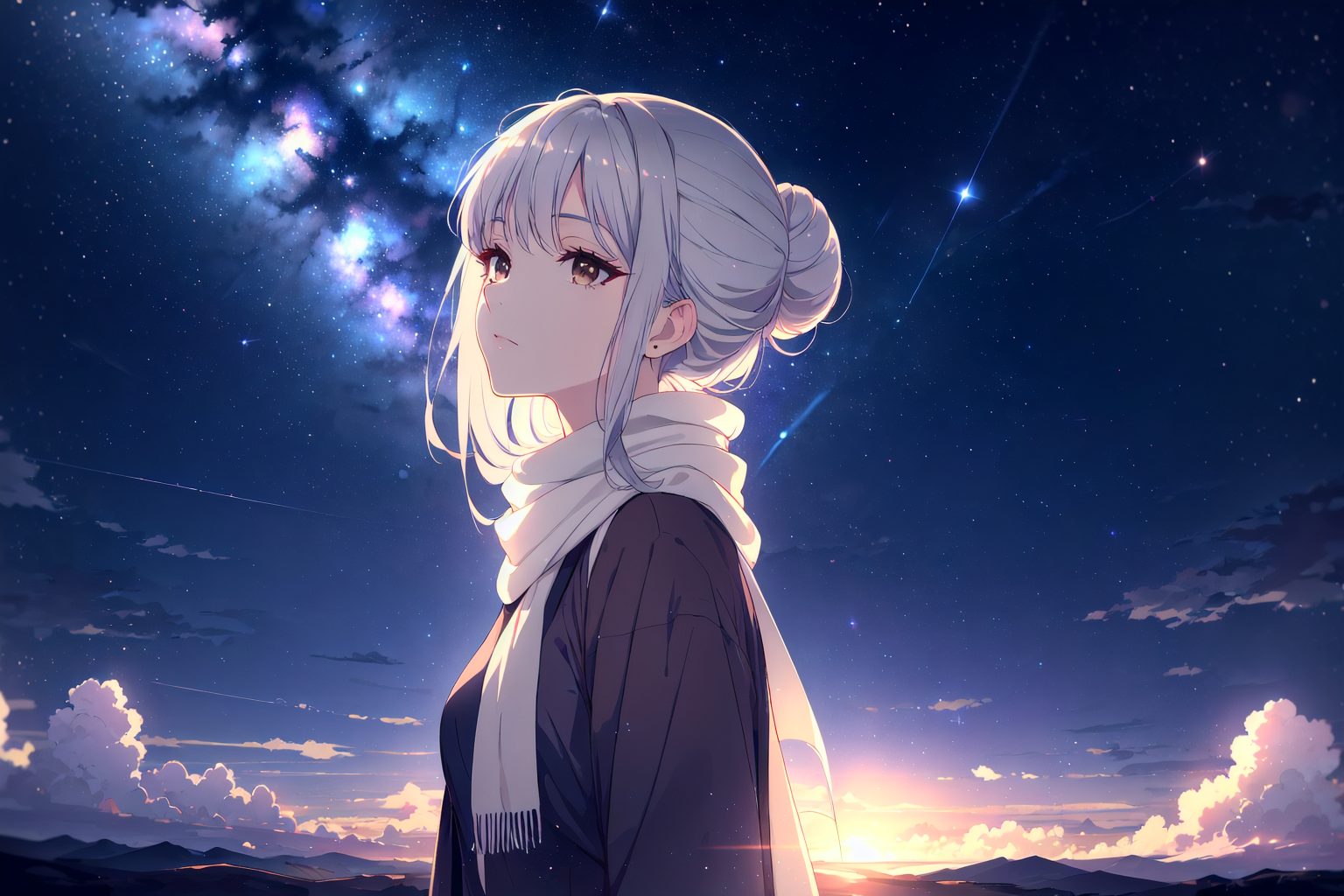 shining sky, vast world, gazing, awe-inspiring expression, distant horizon, clouds, high hill, natural beauty, inspiration, night sky, Shining Stars,